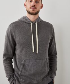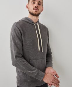 Lightweight cotton, gauze jersey, long sleeve, washed black pullover hooded sweatshirt featuring front pocket, drawcord hood, and rib trim. Thoughtfully designed with ergonomic stitching for maximum comfort and movement. Great for layering.