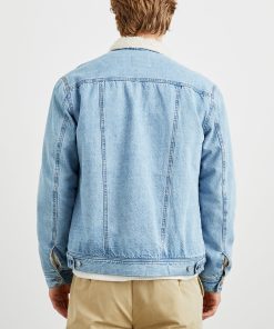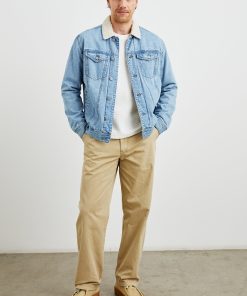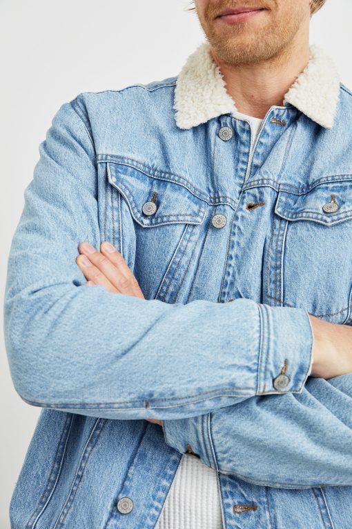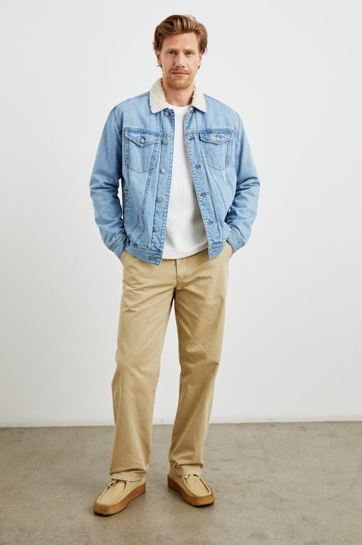 Long sleeve, rugged denim canvas exterior in a light blue, cream collared jacket featuring faux sherpa lining, chest patch pockets with button closures, button-down front closure, and classic fit. This plush, vintage inspired jacket is the perfect layering piece for cooler transitional weather.