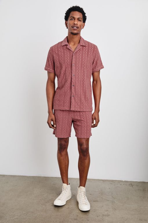The classic pool short, with a twist. The Nova Short is crafted from towel terry fabric featuring a raised jacquard pattern, ideal for outdoor wear around the water. To complete the look, pair with the matching Maverick Shirt.