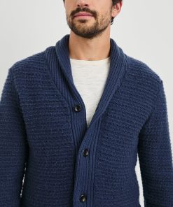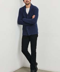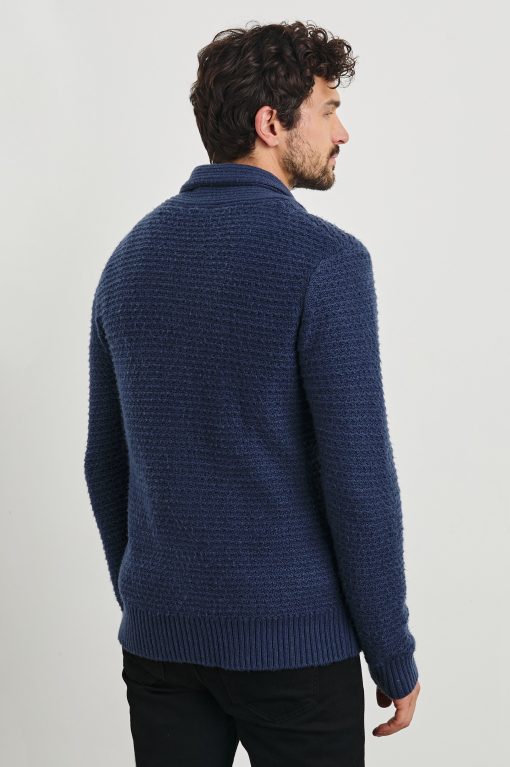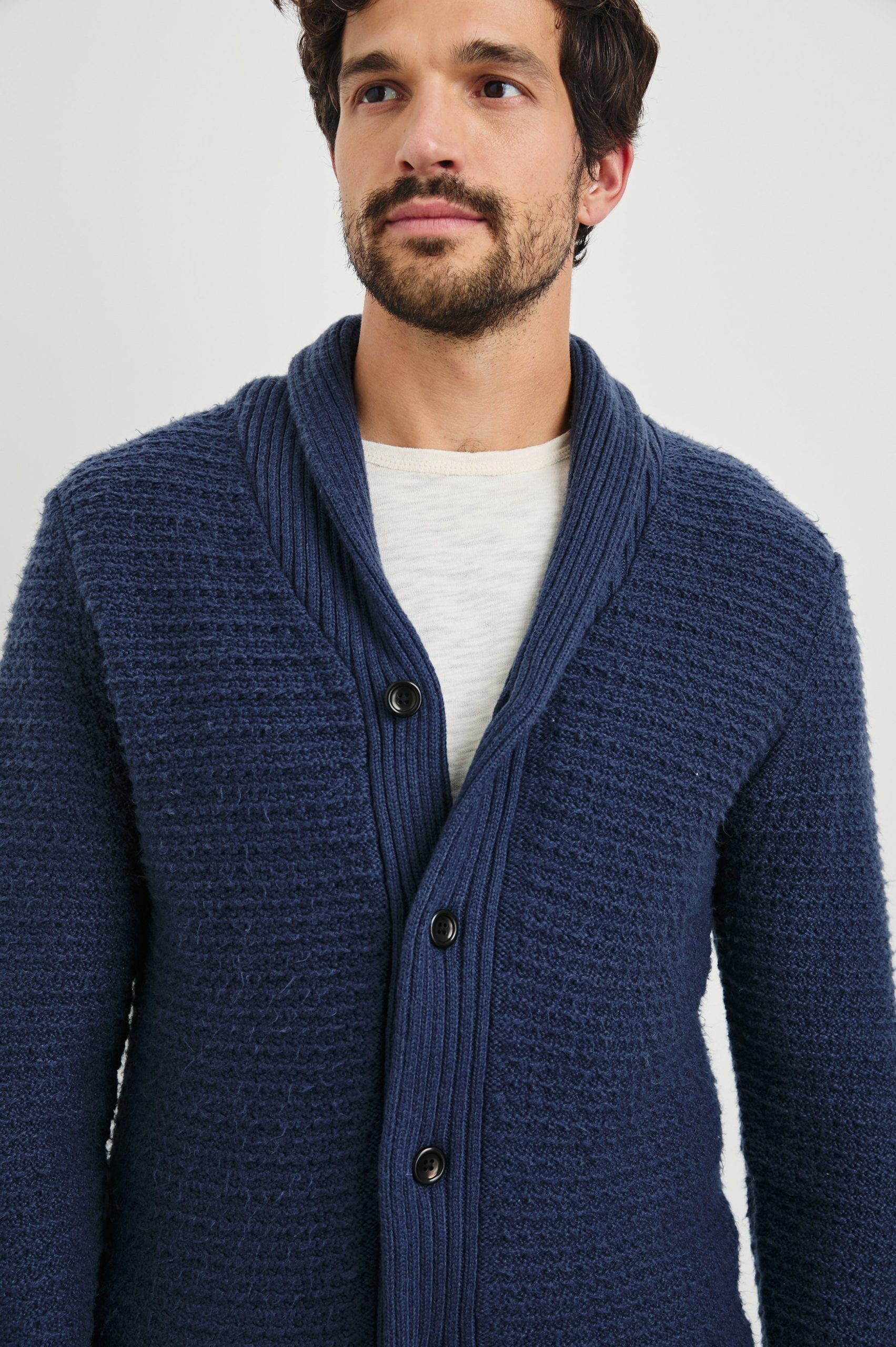 Lightweight, button-down, cotton blend, navy cardigan. This sophisticated shawl-collar cardigan that’s knit from soft, cozy and breathable fibers, is the perfect transitional layering piece. Pair with a t-shirt for a casual look or a buttondown to dress it up.