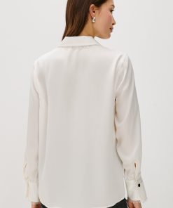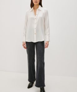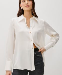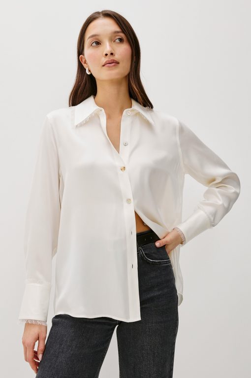 The Abbey is a silk charmeuse button-down with raw edge detailing at the collar and cuffs. It offers an easy fit with a touch of feminine flair.