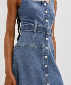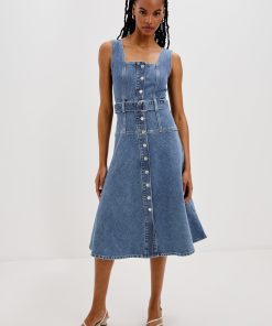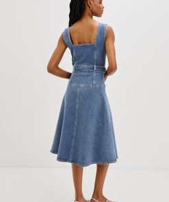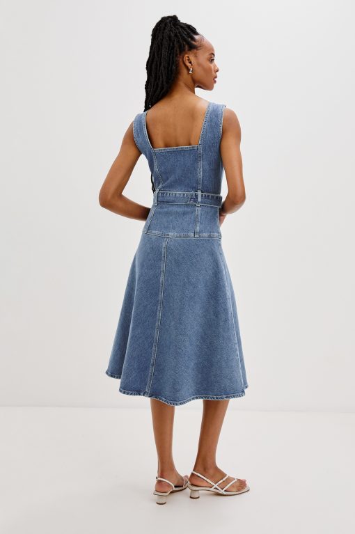 The Aliso denim midi dress features a flared skirt with plenty of movement, crafted from recycled cotton. An adjustable denim belt allows for a personalized, form-flattering fit.