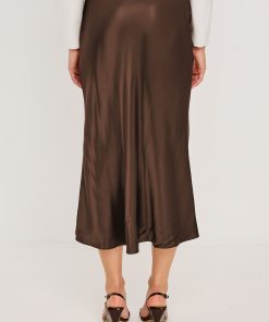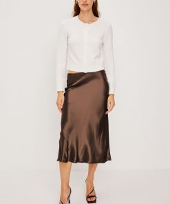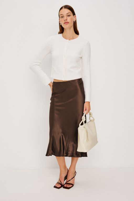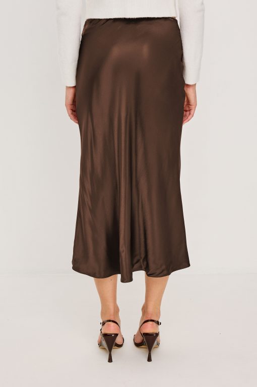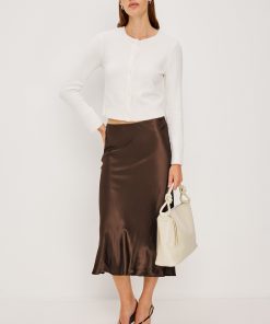 The Anya is a midi-length skirt with a concealed elastic waistband and satin crepe fabrication. Its high-waisted, pull-on design allows for effortless styling.