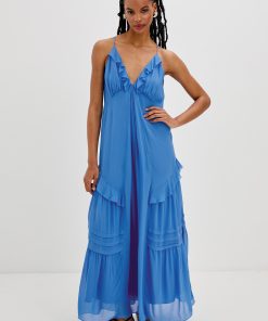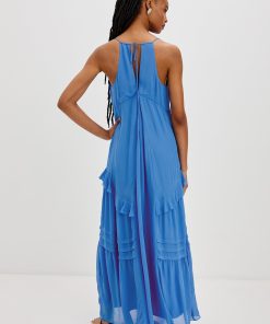 The Boa maxi dress is crafted from ultra-lightweight chiffon with frills along neckline and seams, as well as an adjustable back tie. It features an empire waistline for a flowing silhouette and comfortable wear.