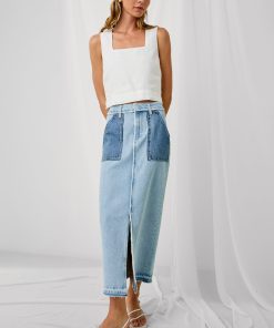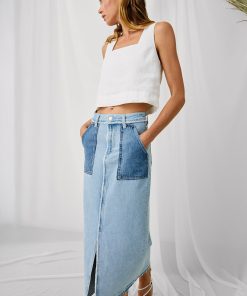 The Calabasas is a high-rise skirt with a front slit and stiff silhouette. It’s crafted from recycled cotton and features raw edges, a release hem, as well as contrast patch pockets.