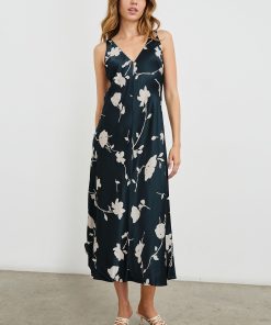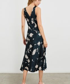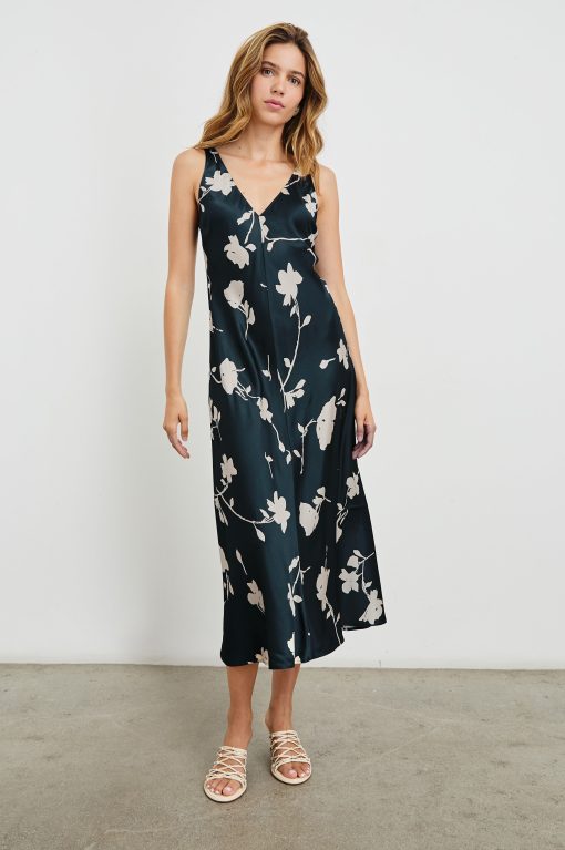 The Camellia is a romantic maxi dress designed to transition through the seasons. It has a lightweight, satin crepe fabrication with a V-neckline and a fitted bodice that flows from the waist.