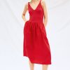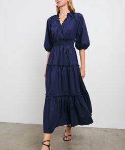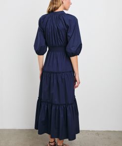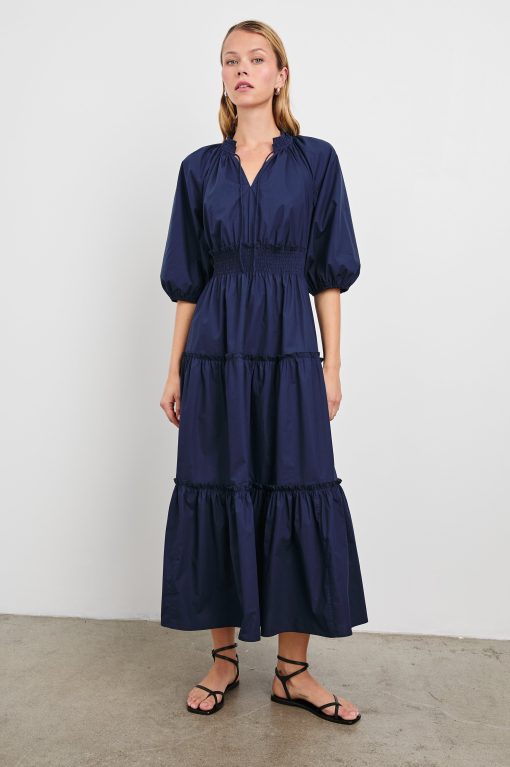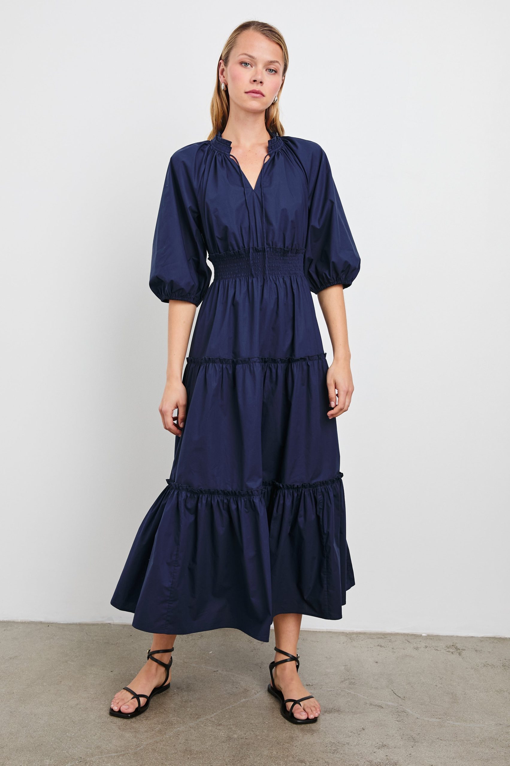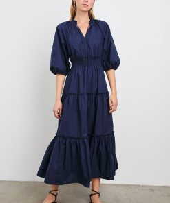 The Caterine is tiered maxi crafted from structured, breathable cotton poplin. With a cinched silhouette, neck ties and ruffled details, this dress is feminine and functional.