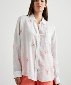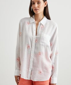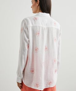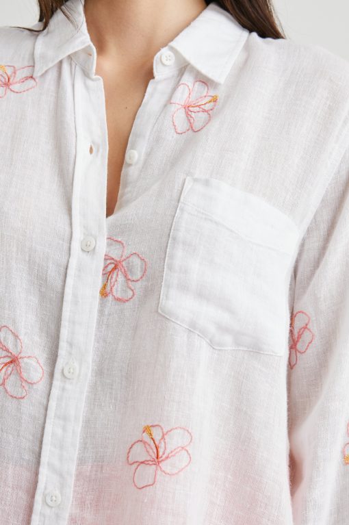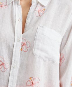 The Charli Shirt is a breezy take on the classic button-down. Made of a lightweight linen blend, white serves as the background of a hibiscus embroidered pattern. It’s designed and tailored for refinement, but can serve both laid back and office casual styles.