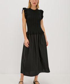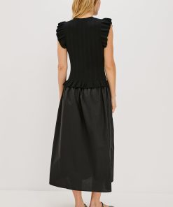 The Deirdre is a maxi-length dress with a unique silhouette—a fine-gauge knit top with flutter sleeves meets a cotton poplin skirt at the waist.