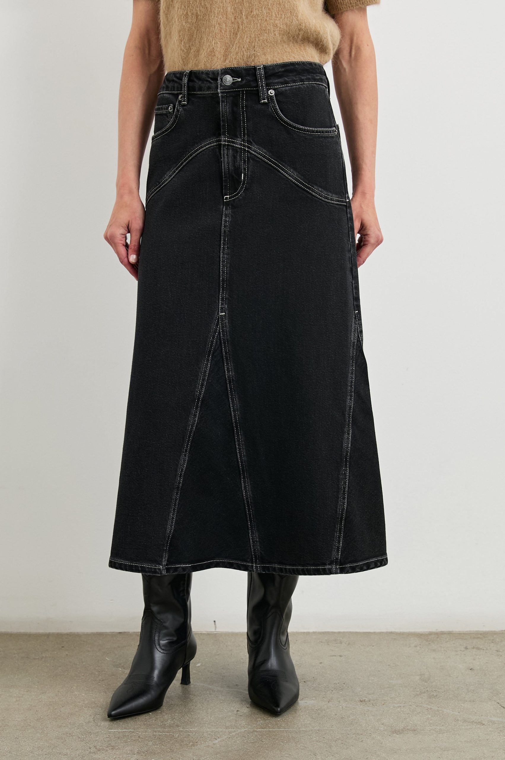 Do denim right with the Del Rey. A mid-calf length skirt with a waist-high fit with Western-inspired seam details, the Del Rey adds a rugged sophistication to any ensemble while transitioning the seasons with ease.