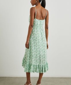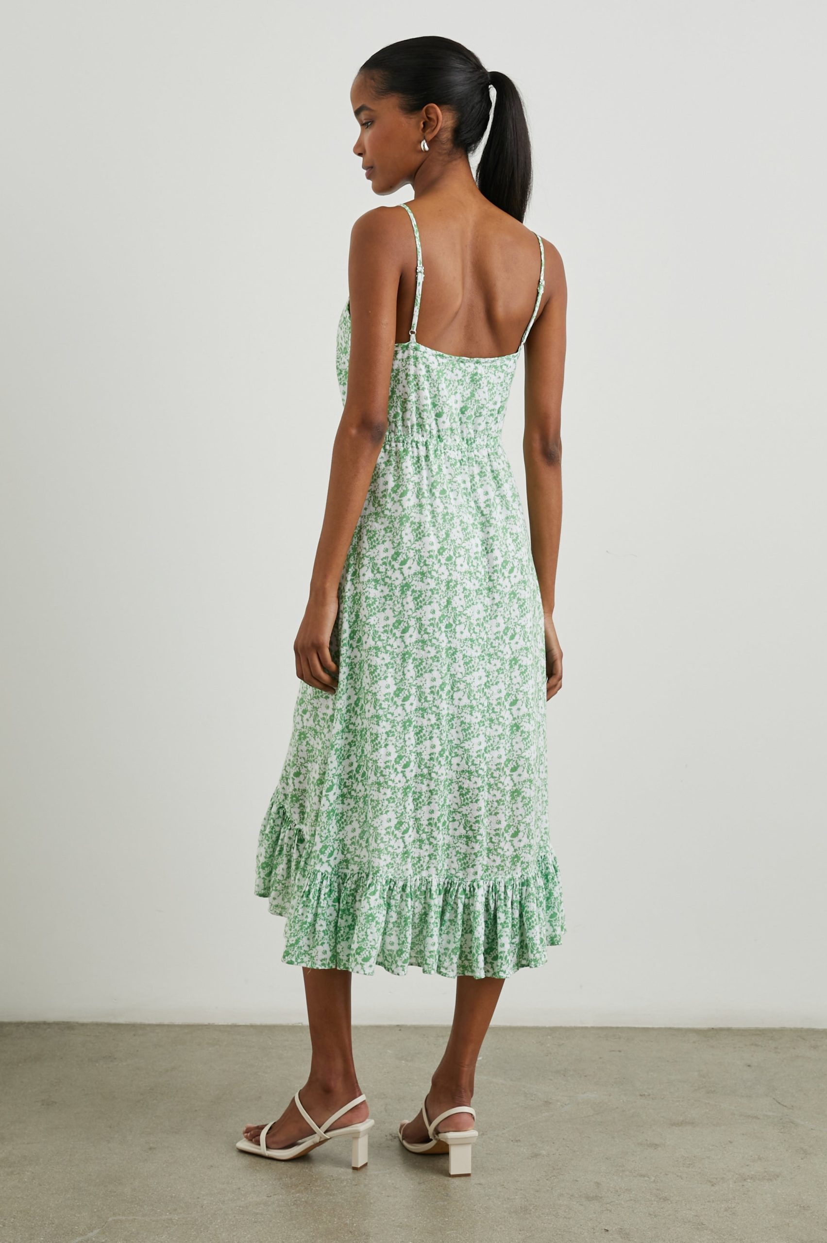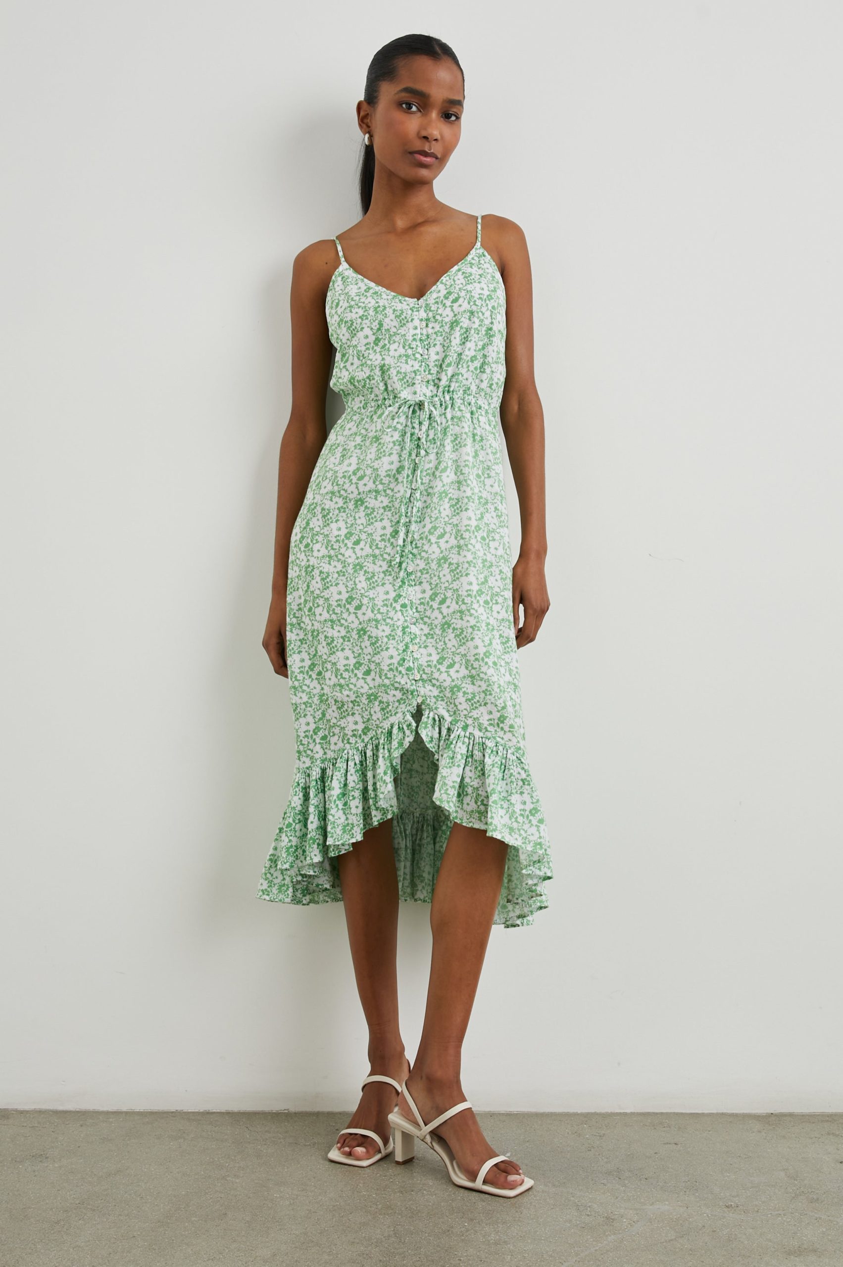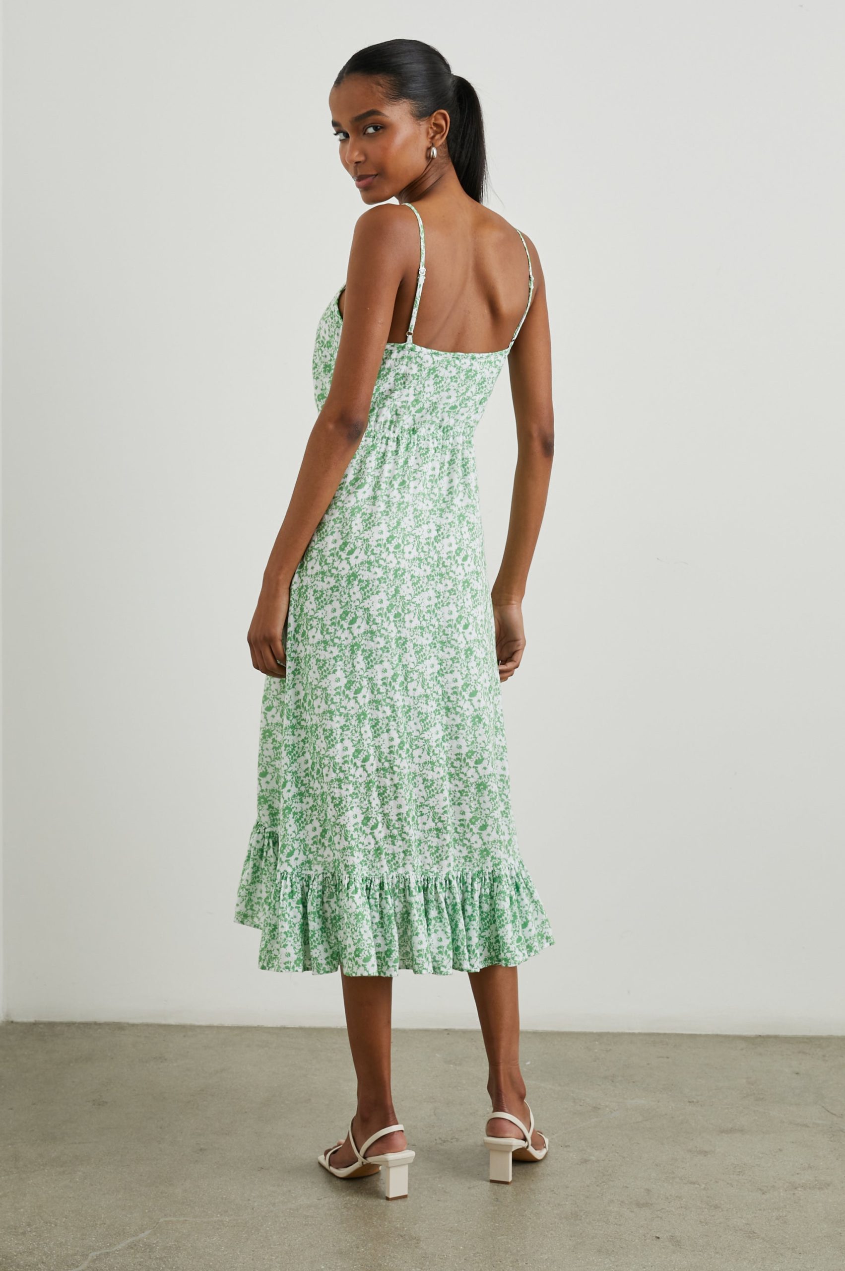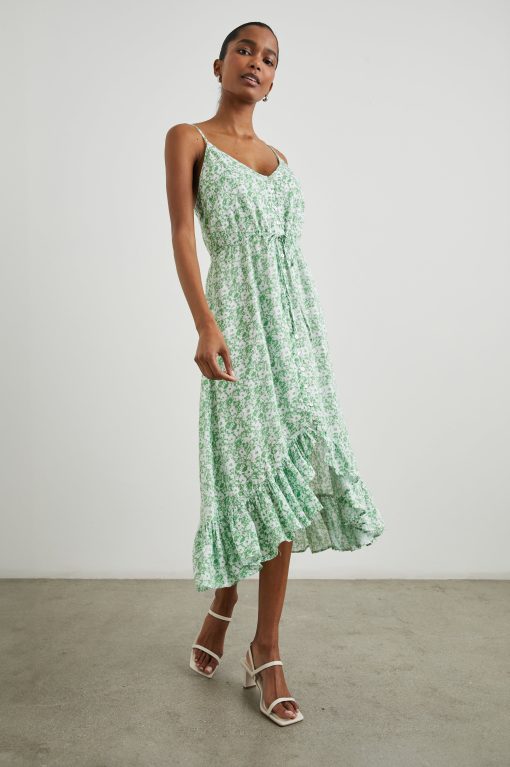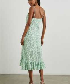 The Frida Dress—with a midi length and rayon-crepe texture—works for your every day, but in an elevated way. It’s comfortably lined with thin, adjustable shoulder straps and fabric-covered buttons. What catches the eye is the vibrant floral print, swingy silhouette, and flattering high-low hem.