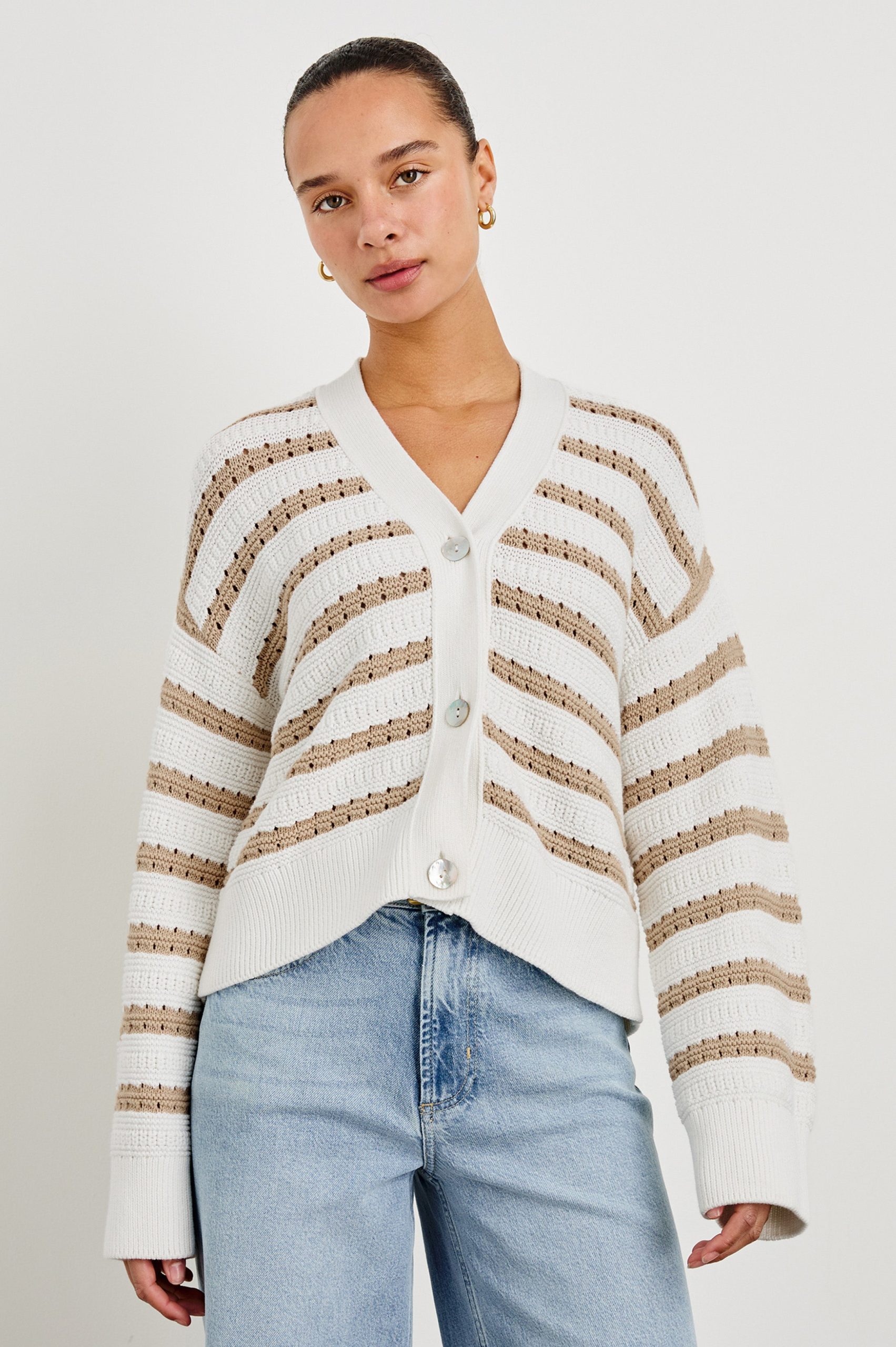 A classic academia-style cardigan, the Geneva is crafted from a 100% cotton yarn with contrasting trimmings for a distinctive touch. With a mid-weight fabrication and relaxed fit, this sweater is trans-seasonal and layerable.