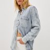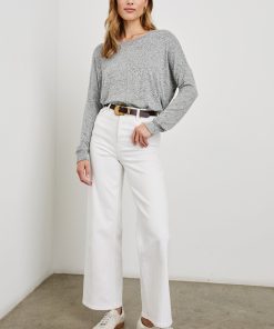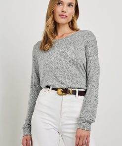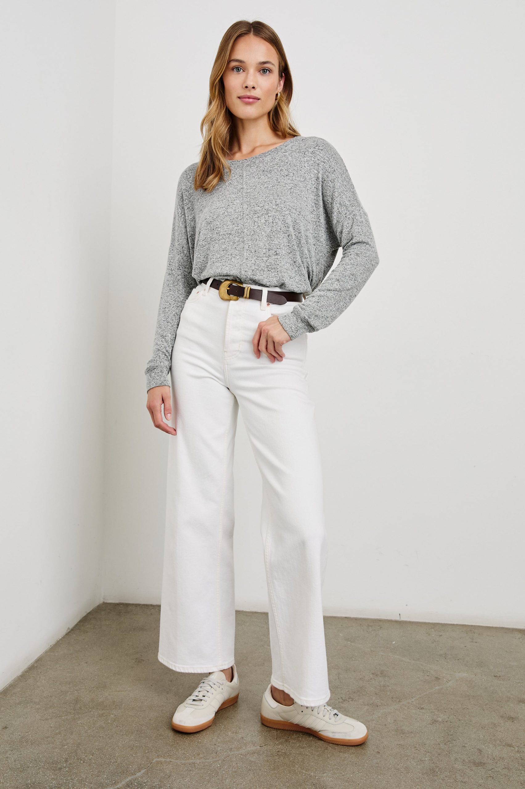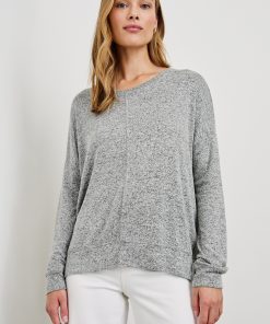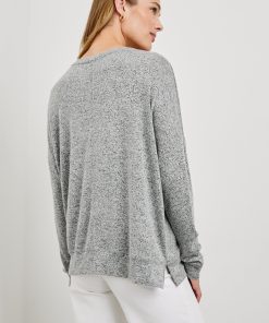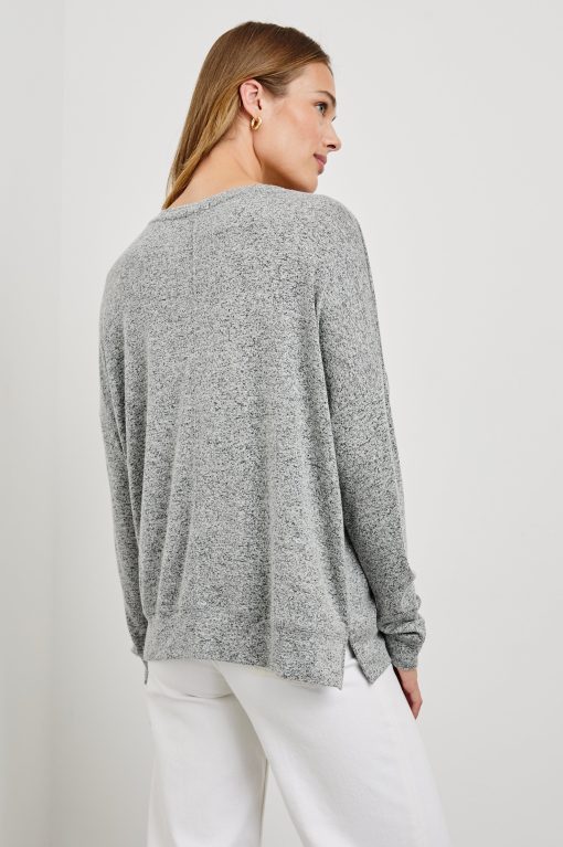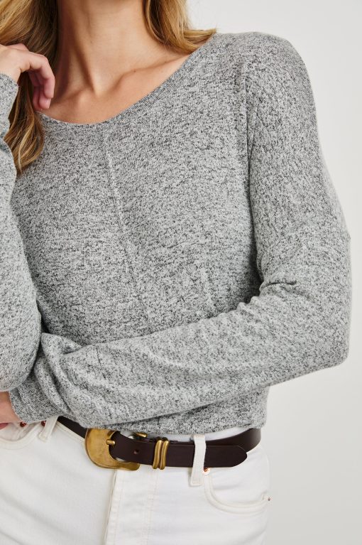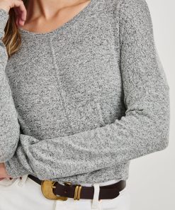 Super soft, lightweight lounge jersey, long sleeve, melange grey scoop neck knit top featuring relaxed fit, center front and back seam detail, dropped shoulder, slimming sleeves, and side slits at hem. This flattering pullover style is perfect for relaxing at home or going about your day in the most comfortable fashion.