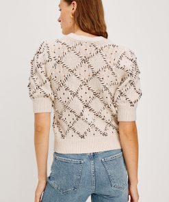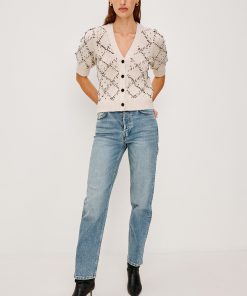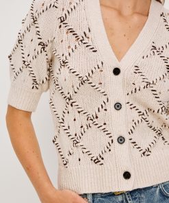 A short-sleeve cardigan sweater that makes a statement. The Isla is crafted from a wool blend for cozy comfort, featuring an argyle texture, braided leather buttons, and a pico squiggle-stripe. Feminine and refined, it effortlessly elevates any outfit.
