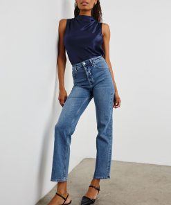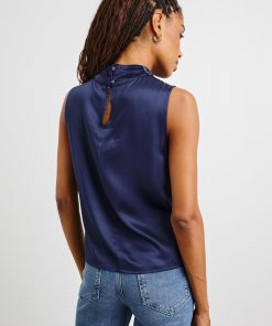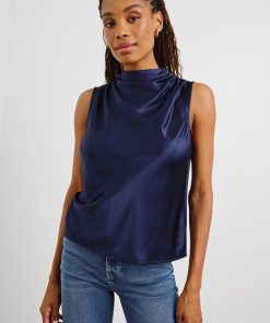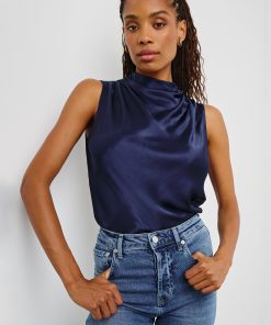 The Kaleen Top is a contemporary tank crafted from smooth, satin back crepe. It features a draped mock neck and fluid silhouette with a traditional camisole fit.