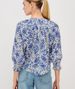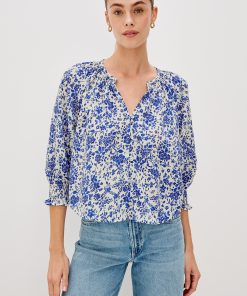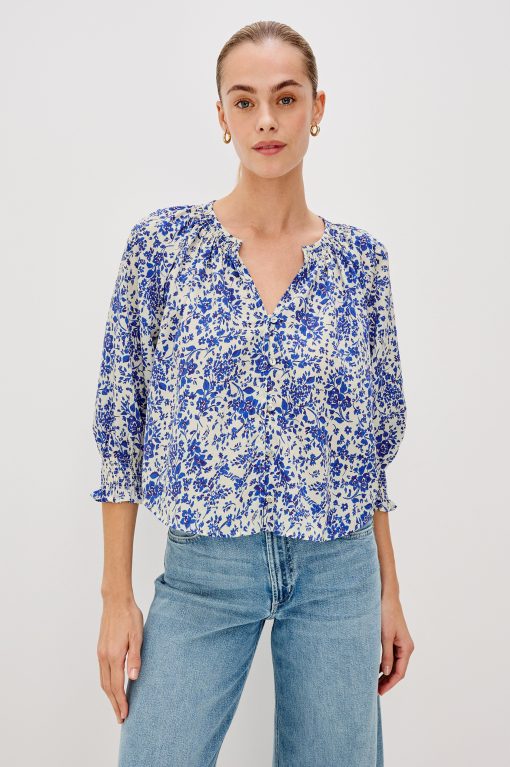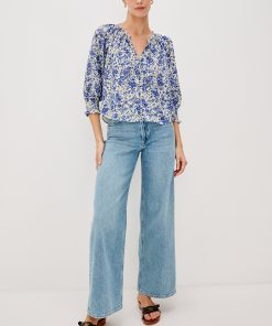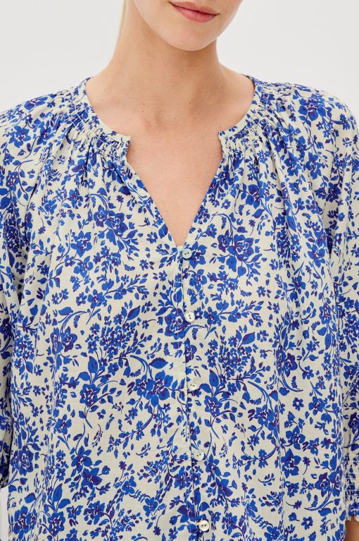 An ultra-soft cotton denim blouse designed to keep you comfortable. The Mariah has peplum, three-quarter sleeves with shirred cuffs, a roomy fit and natural shell buttons.