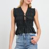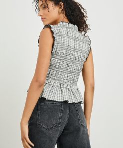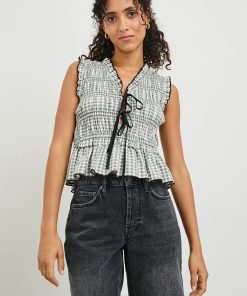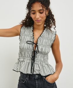 The Martine is a structured peplum tank crafted from heavy cotton poplin. Front ties serve as adjustable closures for the plunging neckline, while delicate ruffle details complete the look.