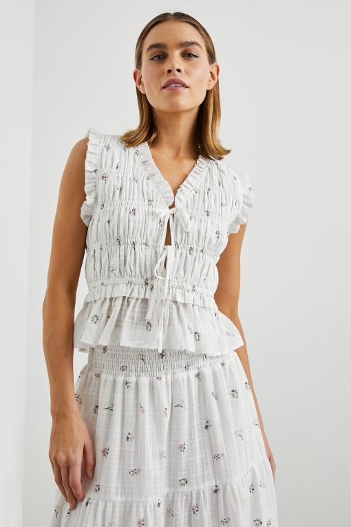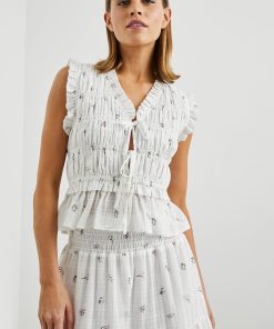 Crafted from 100% lightly textured cotton adorned with dainty bouquets, the Martine does feminine details right with smocking, ruffled edges and front-ties for a customizable fit.