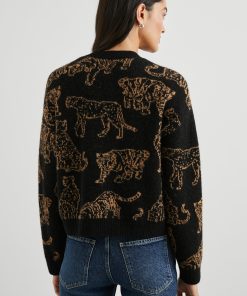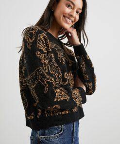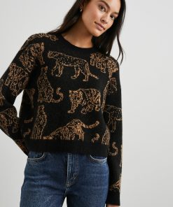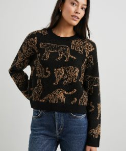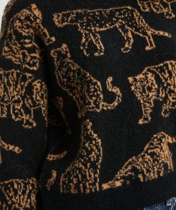 The Perci Sweater is made from ultra-soft wool alpaca blend. It's detailed with camel wild cats against a black background and features include a dropped shoulder, relaxed fit, and thick ribbed trim at the cuffs and hem.