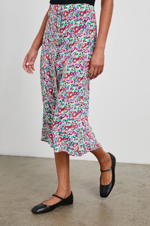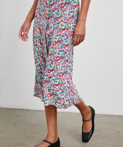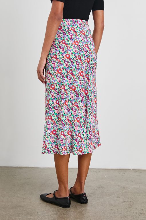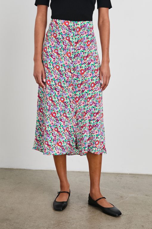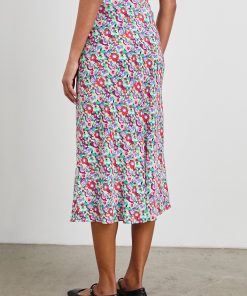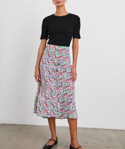 The Rosetta Skirt is adorned in punchy, springtime flowers and features a midi length and hidden elastic at the waist.