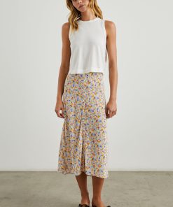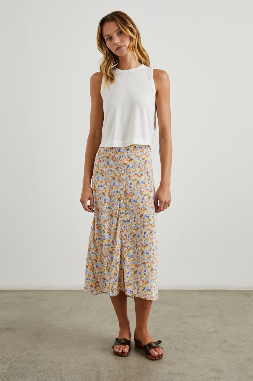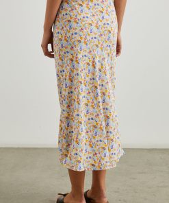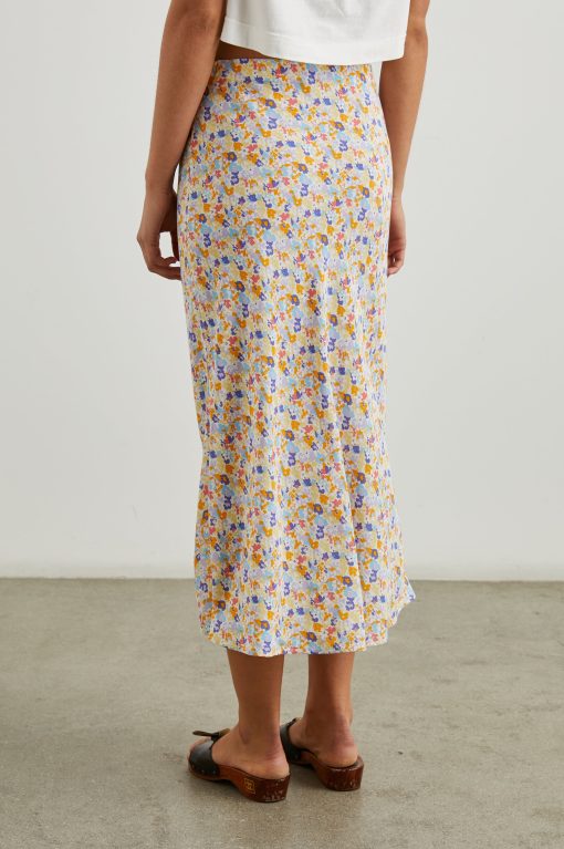The Rosetta is a midi length skirt adorned in punchy, springtime flowers and features a hidden elastic at the waistband.
