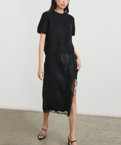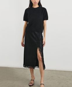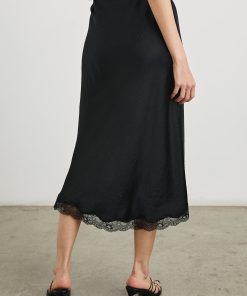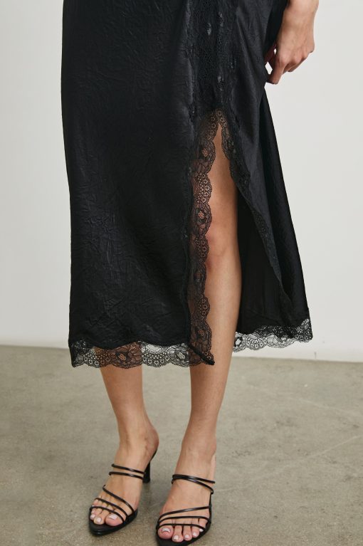 The Rylan is crafted from an ultra-smooth black crinkle satin and finished with a scalloped lace trim. A hidden elasticated waist ensures all-day comfort, while the front thigh-slit ensures fluidity. Dress with your favorite staple to complete this outfit.