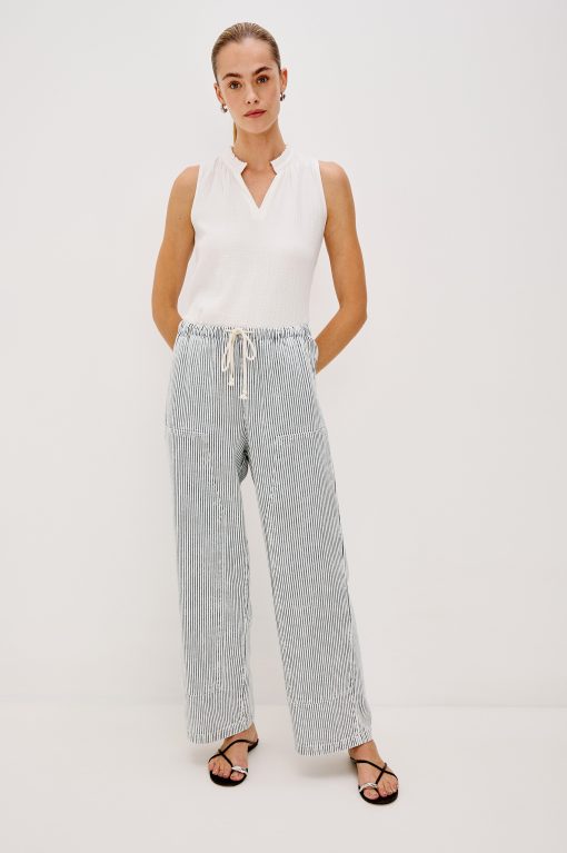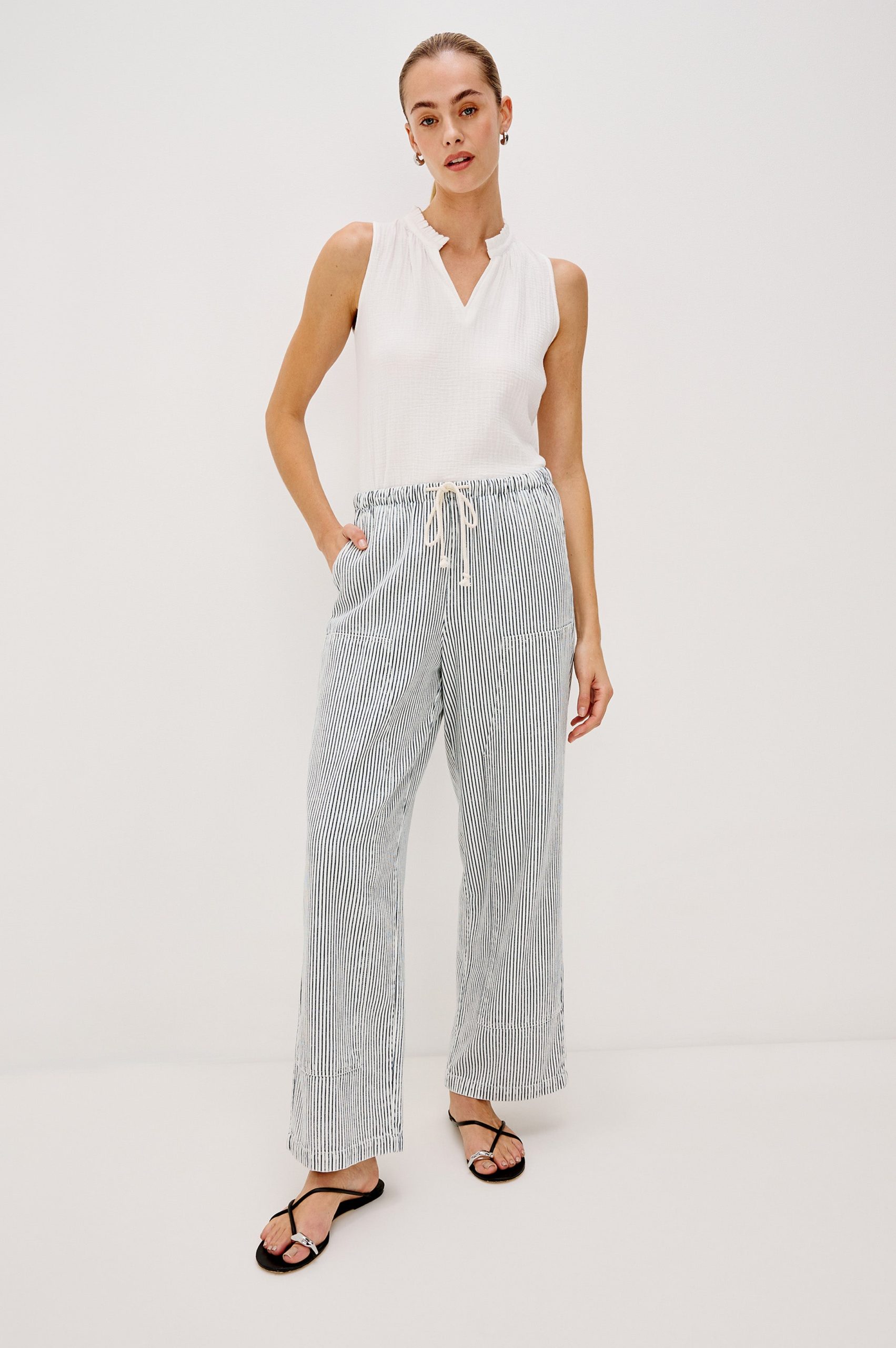 The Sanderson is a mid-rise, relaxed fit denim pant crafted from lightweight, supple cotton. Featuring carpenter panels for a laid-back look and an adjustable corded drawstring for a customized fit.