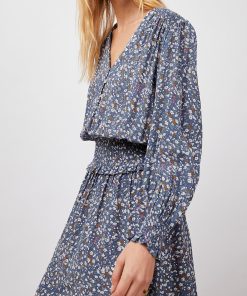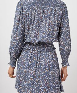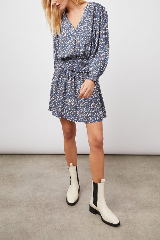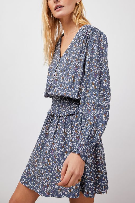 A pullover style dress with elastic waistline and flowy skirt make for easy wearability with a feminine touch. Made from lightweight, rayon crepe, this partially lined mini dress features a v-neckline, front loop natural shell buttons, classic fit, lined skirt, and smocking at front and back yokes, cuffs, and elastic waist.