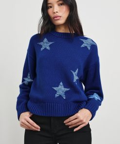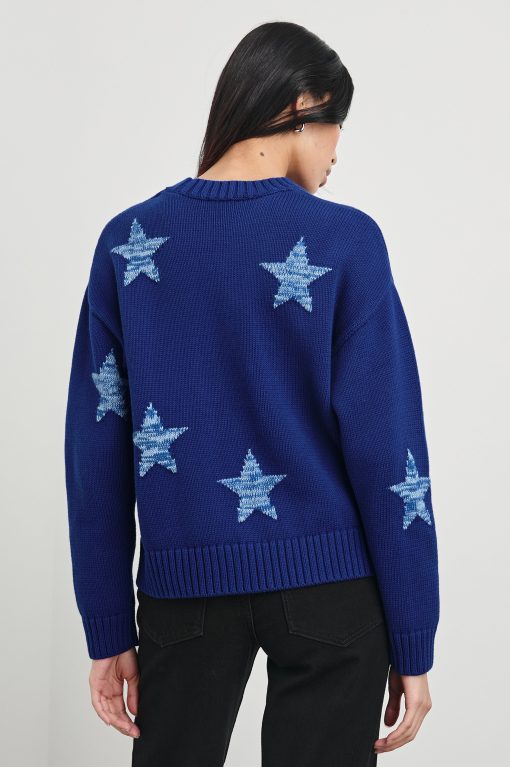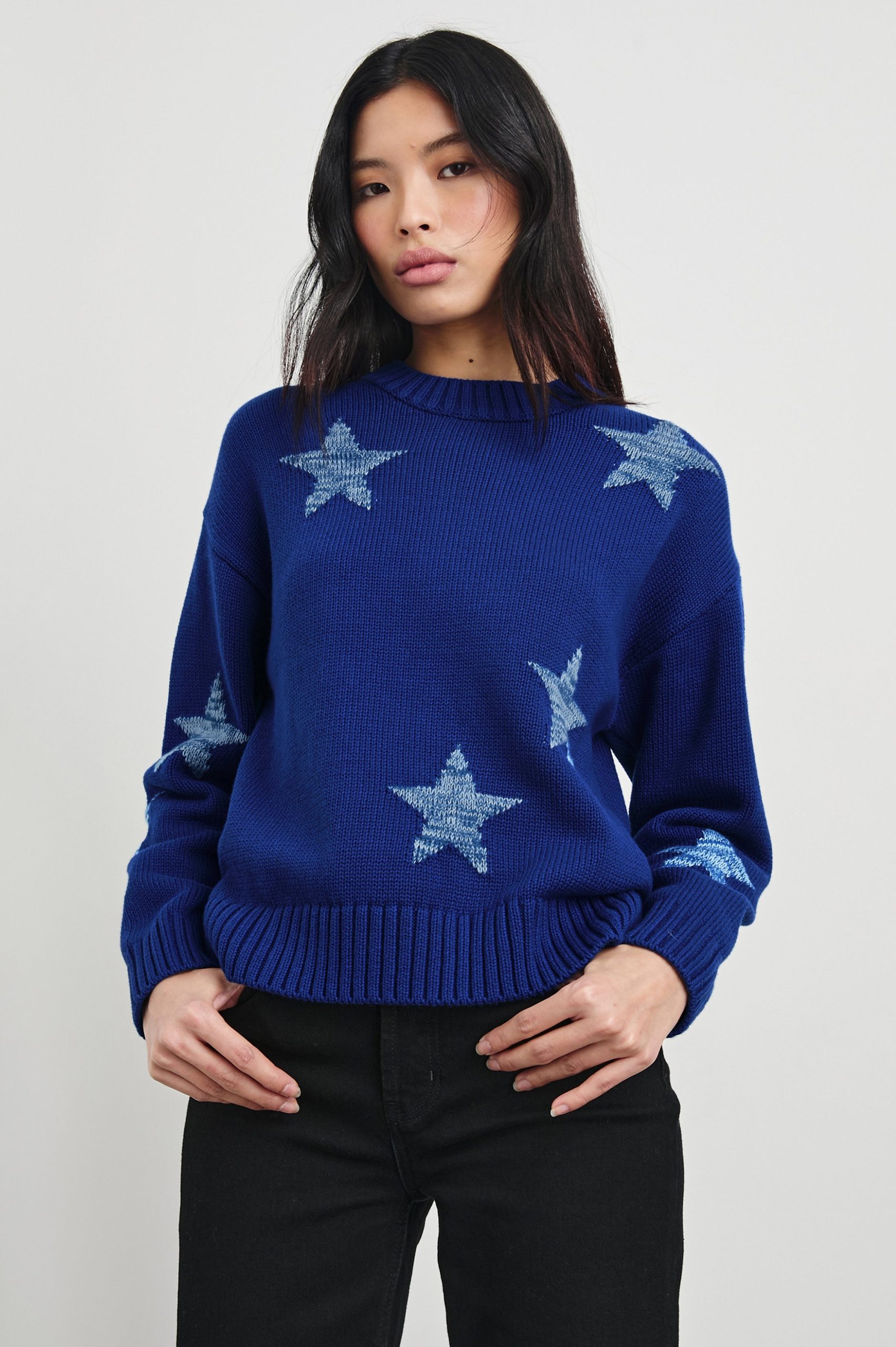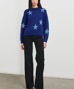 A transitional sweater with an ultra-cozy cotton cashmere fabrication, the Zoey has a dropped-shoulder, relaxed silhouette, and intergalactic design. Throw on with a midi-dress or jeans and stay warm in style.