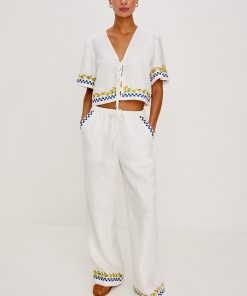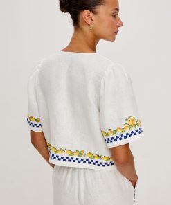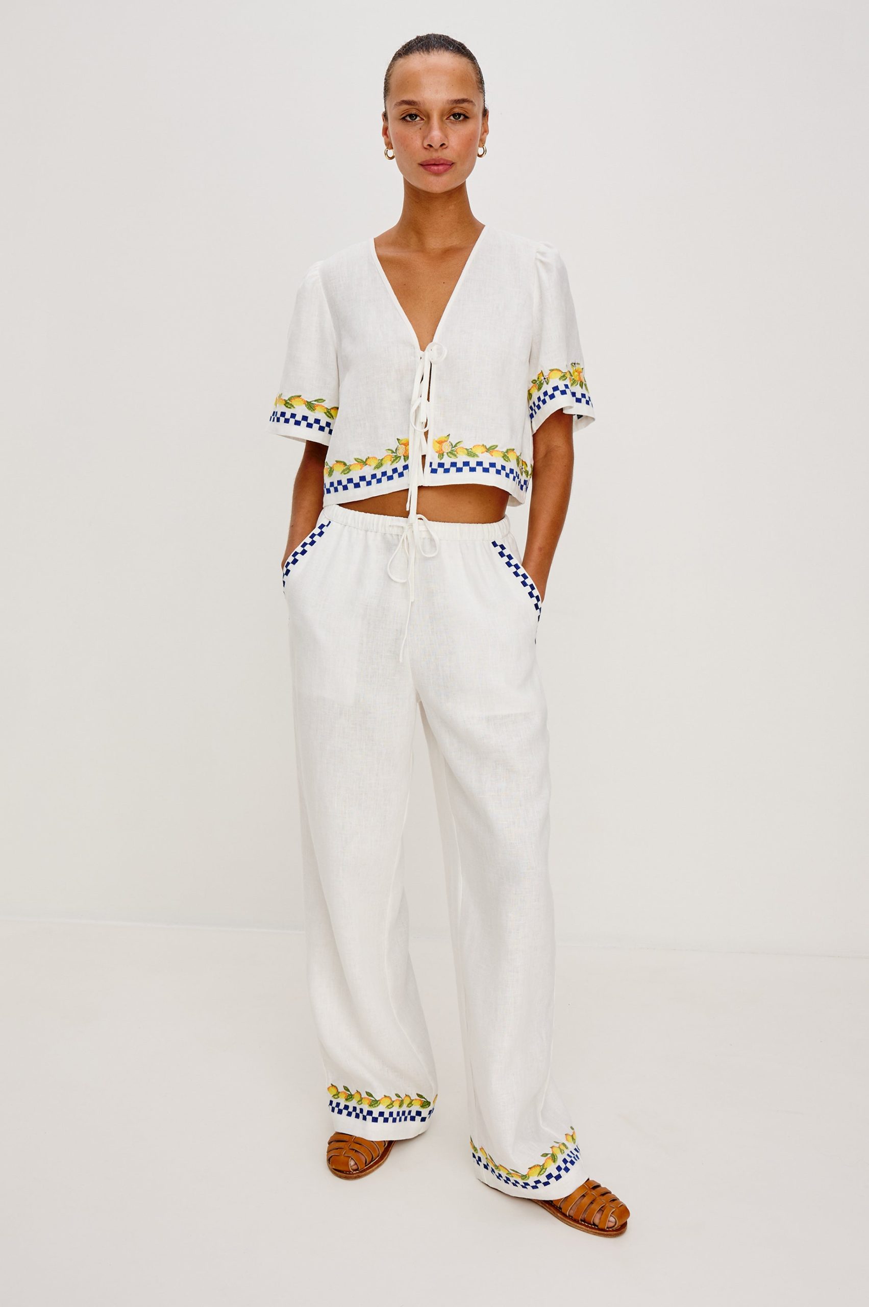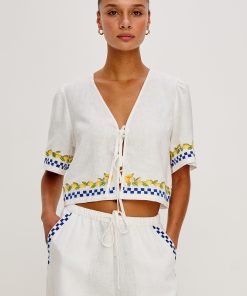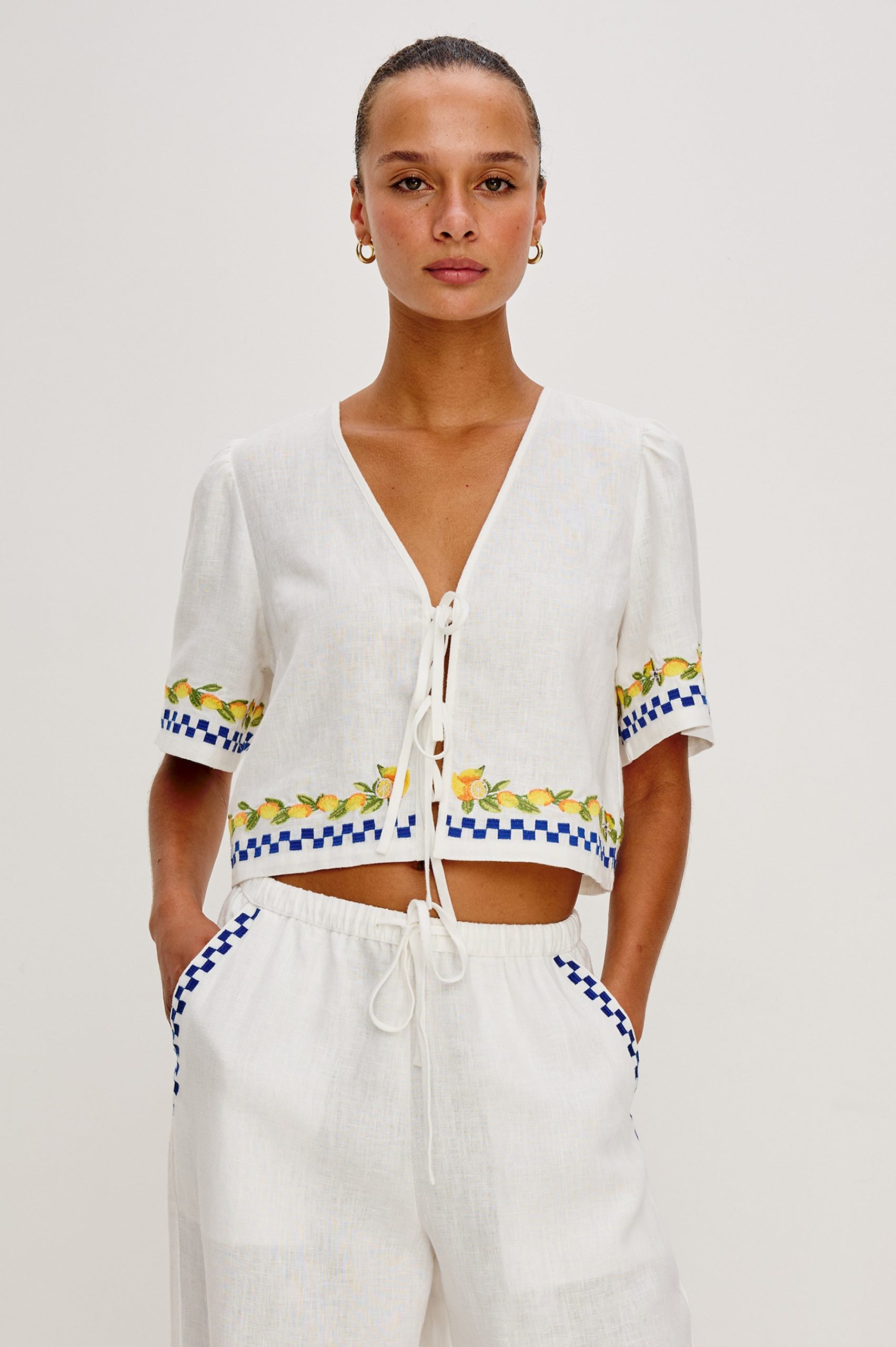 Meet the Pari Top in heavy luxe linen. An exclusive Giadzy x Rails piece, it features tie closures at the front and an ultra-cropped length—finished with Sorrento-inspired embroidery.